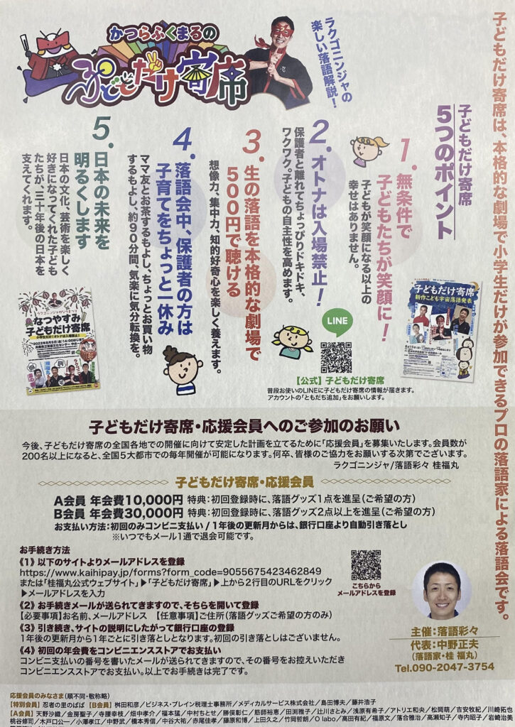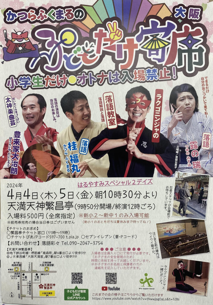 木本小百合がロゴデザインとキャラクターデザインを担当し、アトリエ和央が応援させていただいている『子どもだけ寄席』が4月4日(木)と5日(金)に大阪で開催されます。