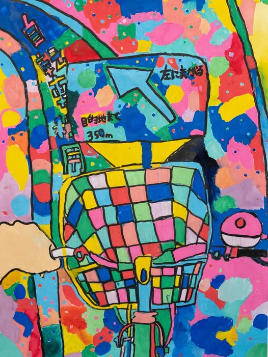 テーマは「夢の自転車」「乗ってみたい!作ってみたい!あったらいいな」を想像しながら、未来のアイディア自転車をMちゃんらしく、カラフルで可愛くのびのびと表現しています。