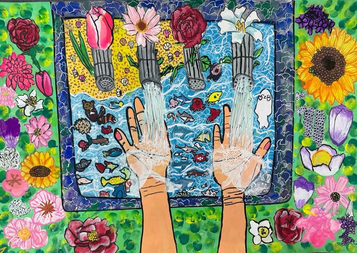 受賞のお知らせ 2025.10.21 作品紹介 Tweet Share Hatena Pocket RSS feedly Pin it この記事のタイトルとURLをコピーする 大阪市水道局主催【令和7年 水の絵コンクール】にて、I.Kさん(小3)の作品が、応募総数8,730点の中から見事「優秀」に選ばれました。お花で彩られた蛇口から流れる水が、美しい大理石の洗面台を伝い、その先には海の世界が広がっています。細部まで丁寧に描かれた、とても繊細で美しい秀作です。Kさん、本当におめでとうございます。 Tweet Share Hatena Pocket RSS feedly Pin it この記事のタイトルとURLをコピーする 嬉しいご報告 前の記事 受賞のお知らせ 次の記事