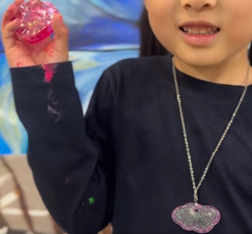 年中さんの女の子が、レジン液を使ってとっても可愛いペンダントと、カチャカチャと鳴る楽器のようなオモチャを作ってくれました。