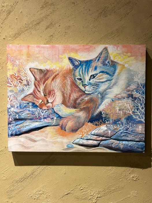 穏やかに寄り添う2匹の猫の表情が温かく、淡い色彩と柔らかな筆致が夢の中のような静けさを感じます。