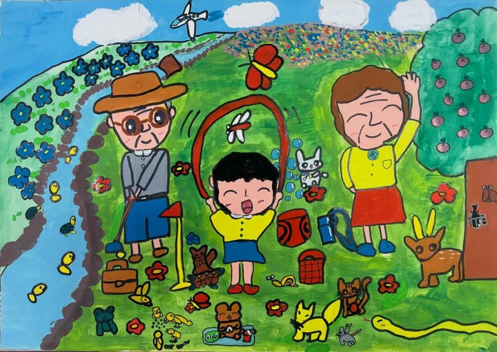 イチニ!イチニ!の日 2025.12.15 作品紹介 Tweet Share Hatena Pocket RSS feedly Pin it この記事のタイトルとURLをコピーする 12月12日は語呂合わせで “イチニ!イチニ!” の日ということで、小学3年生の女の子が描いた、元気いっぱいの体操風景の作品をご紹介します。おじいちゃん・おばあちゃん・妹ちゃんが楽しそうに体操する姿や、周りの可愛らしい動物たちがとても微笑ましく、見ているだけで明るく元気になれる、愛情たっぷりの秀作です。 Tweet Share Hatena Pocket RSS feedly Pin it この記事のタイトルとURLをコピーする 桜の花びらが雪へと 前の記事 教室の様子 次の記事