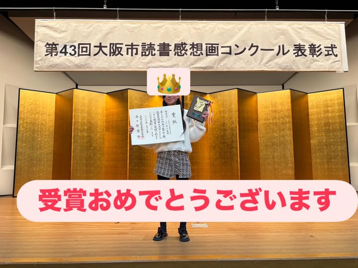 第43回 大阪市読書感想画コンクール にて、H.Uさん(小学6年生)が「優秀賞」 を受賞され、大阪市立中央図書館 にて行われた表彰式で授与されました。