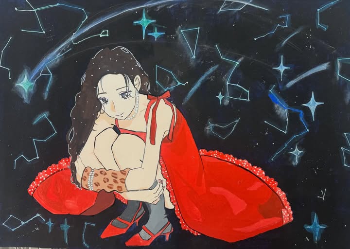 星座に包まれる夜の世界。赤いドレスの存在感と、どこか切ない表情。