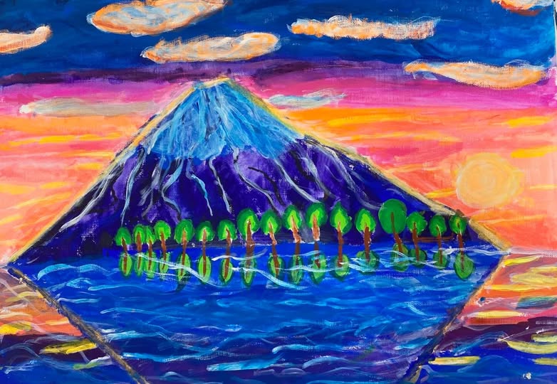 富士山と樹海をテーマに、力強い色彩と大胆な構成で描かれた一枚。
