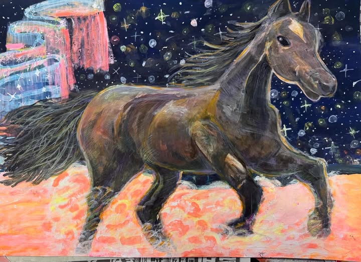 躍動感あふれる馬の姿と、やわらかく広がる光の表現が印象的で、まるで物語の一場面のようです。